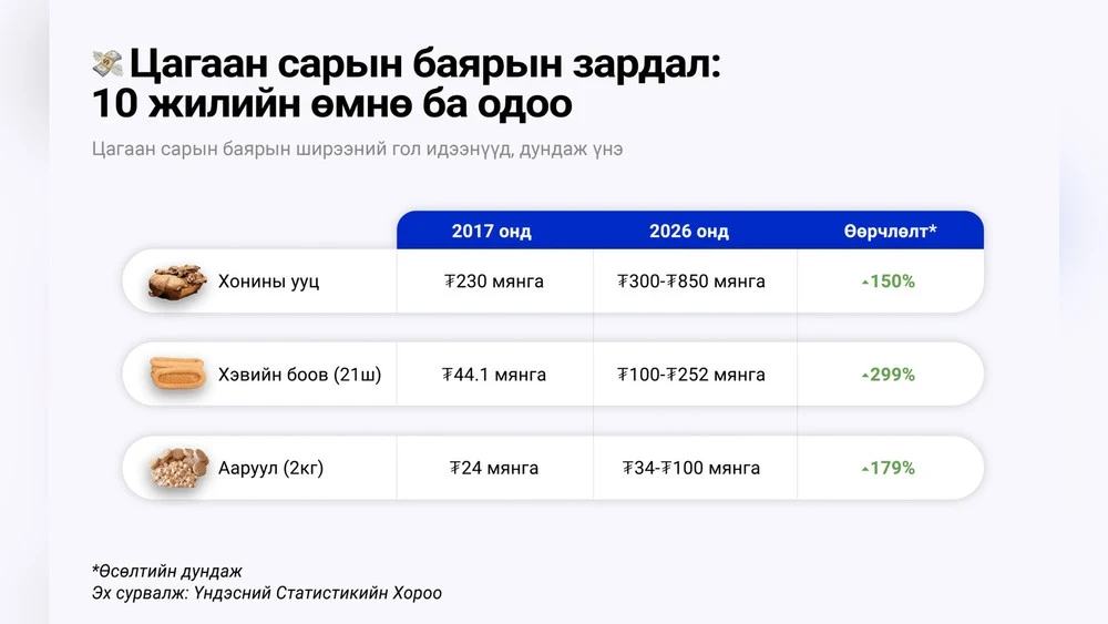 Сравнивая с 2017 годом, цены на традиционные блюда для стола Цагаан сара, такие как ууц (баранина спина), хэвийн боов (монгольское печенье, используемое для украшения праздничной тарелки) и ааруул, хурууд (традиционный монгольский сушеный творог), значительно возросли. За последние десять лет цена на ууц увеличилась на 150%, сейчас она колеблется от ₮300 до ₮850 тысяч (от $85 до $240), в то время как цена на 2 кг ааруул возросла на 179% и варьируется от ₮34 до ₮100 тысяч (от $10 до $28). Цены на хэвийн боов подскочили на 299%, составив от ₮100 до ₮252 (от $28 до $71). Таким образом, на сегодняшний день цена хэвийн боов возросла почти в три раза, цена ууц — в 2.5 раза, а цена ааруул — в 1.8 раза.