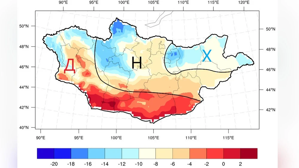 В западных аймаках ожидается, что средняя температура воздуха будет близка к многолетнему среднему показателю в восточном Завхане и северном Баянхонгоре. В остальных районах температура превысит средние значения (см. рис. 1).