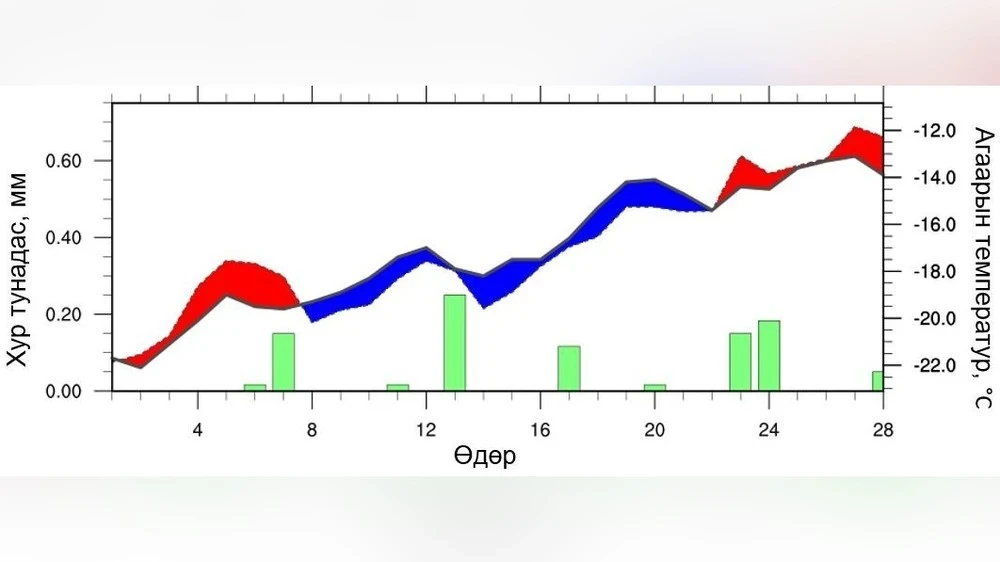 В восточных аймаках средняя температура в феврале ожидается ниже среднемноголетних значений, при этом в южной части Сухбаатара осадки будут близки к средним показателям, а в других районах они будут выше средних. На рисунке 9 представлена динамика температуры и осадков. В начале месяца дневные температуры будут выше средних, однако к концу первых десяти дней, в начале и середине второго десятилетия, а также в начале третьего предсказывается снижение на 1–5 °C по сравнению со среднемноголетними значениями.